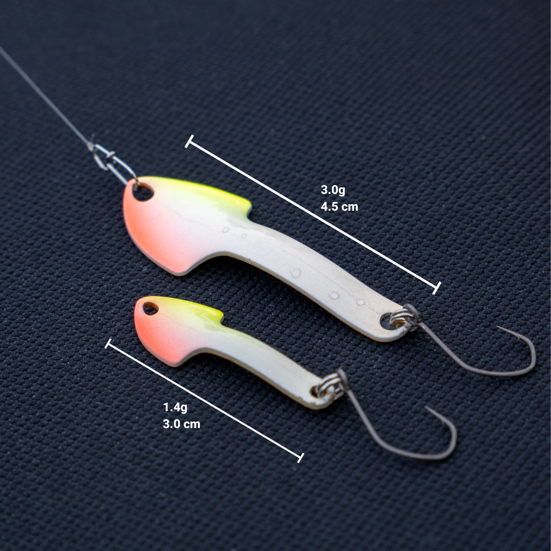 Selbst der große Scoop Spoon mit 3,0 g bleibt oberflächennah, während herkömmliche Forellenspoons dieser Größe meist schnell in tiefere Wasserschichten absacken. Genau das macht den Scoop so effektiv auf aktive und misstrauische Forellen.